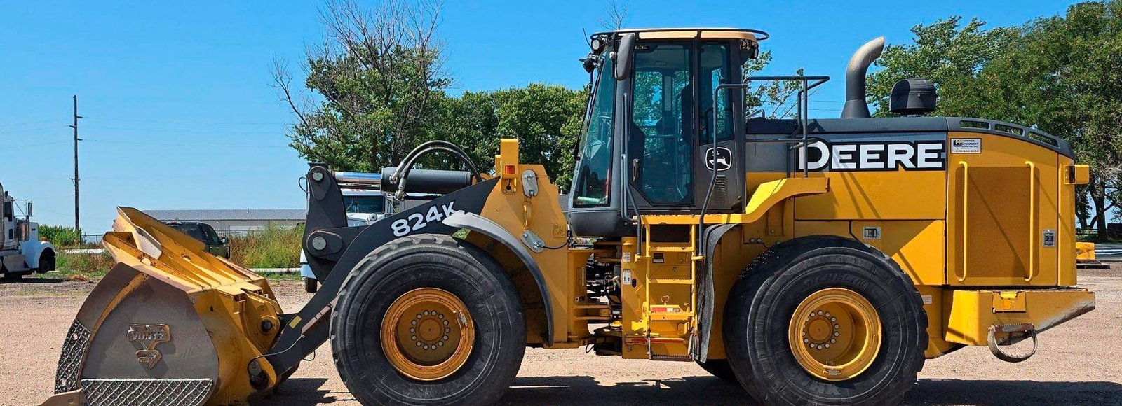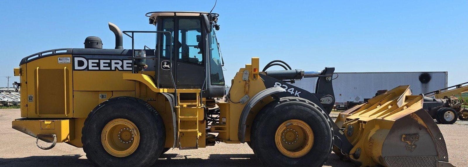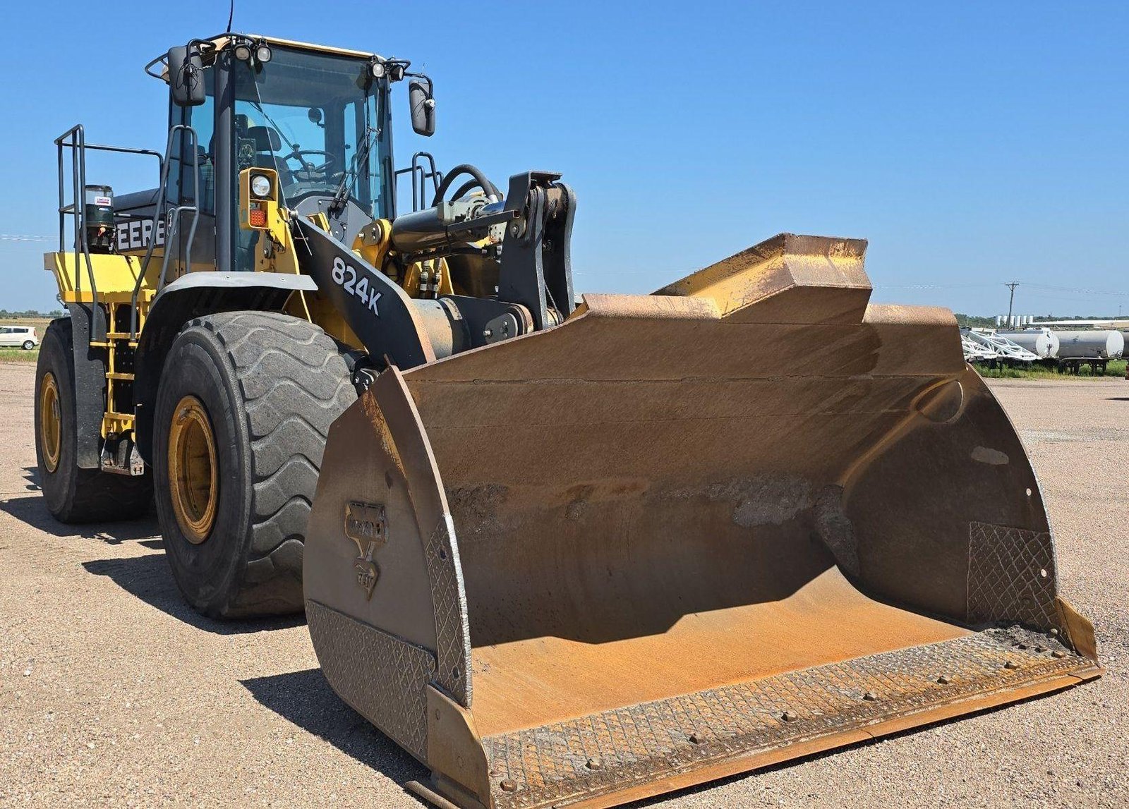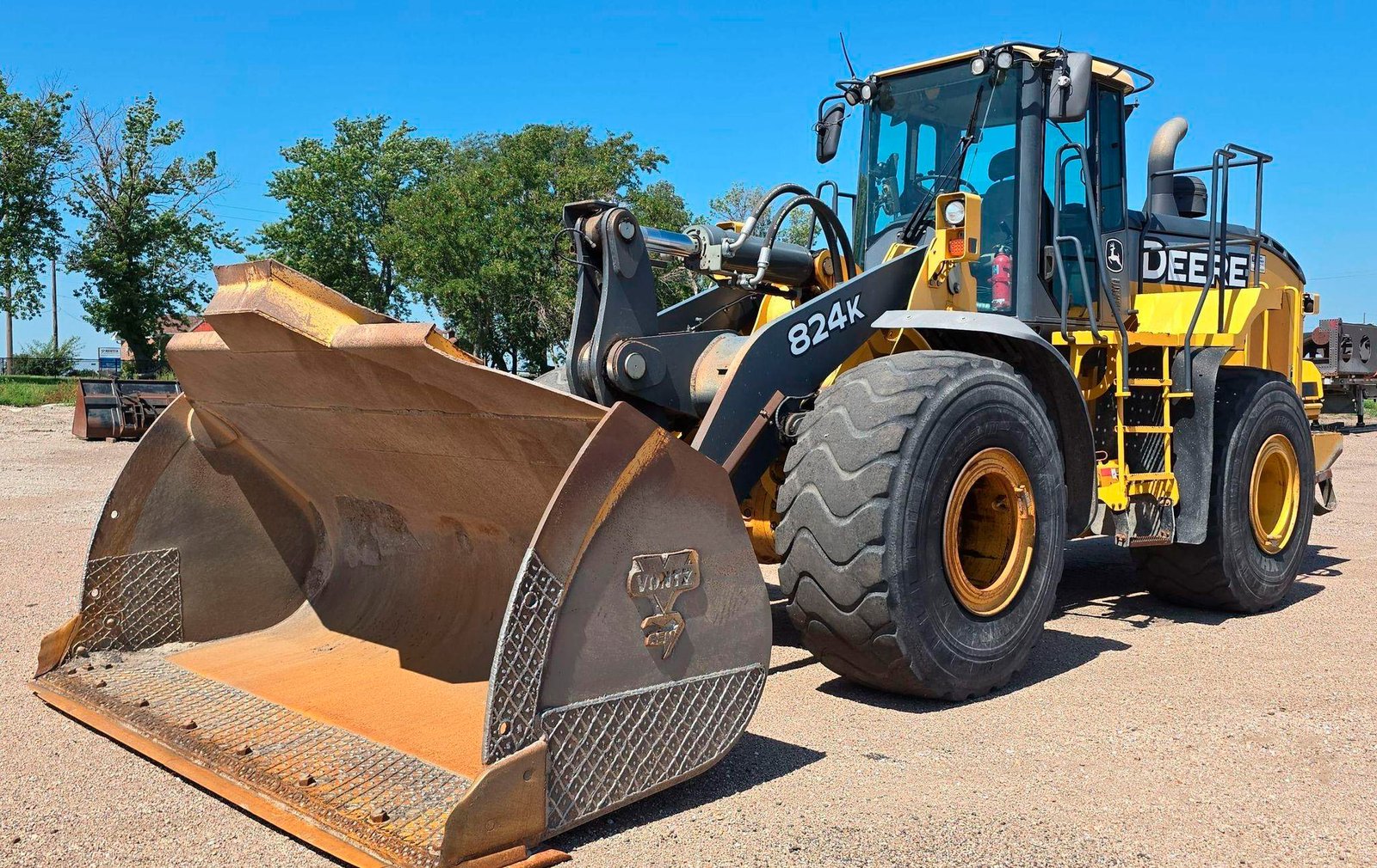 2014 John Deere 824K Wheel Loader — well-kept unit with 9,633 hours. Powered by a John Deere 6135HDW02 diesel (6-cyl). Equipped with powershift transmission, enclosed cab with A/C & heat, and a 6.5 cu.yd TRM bucket.