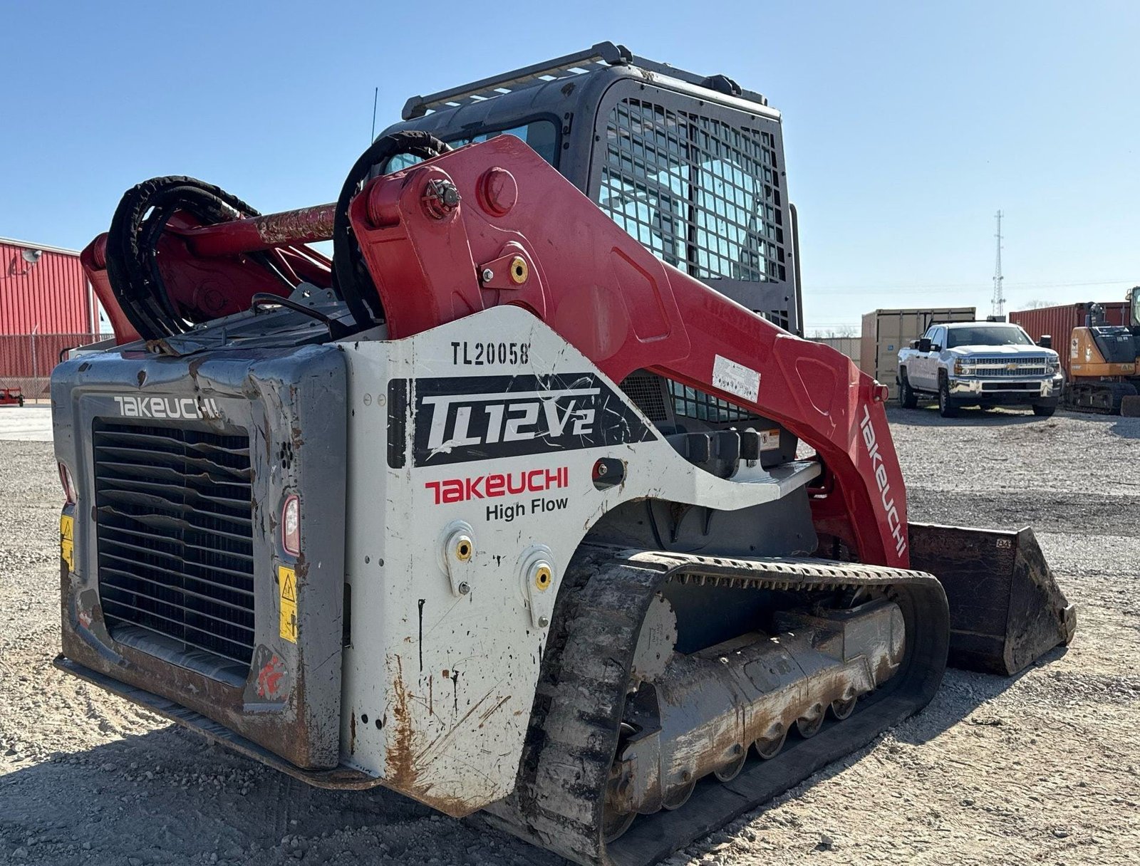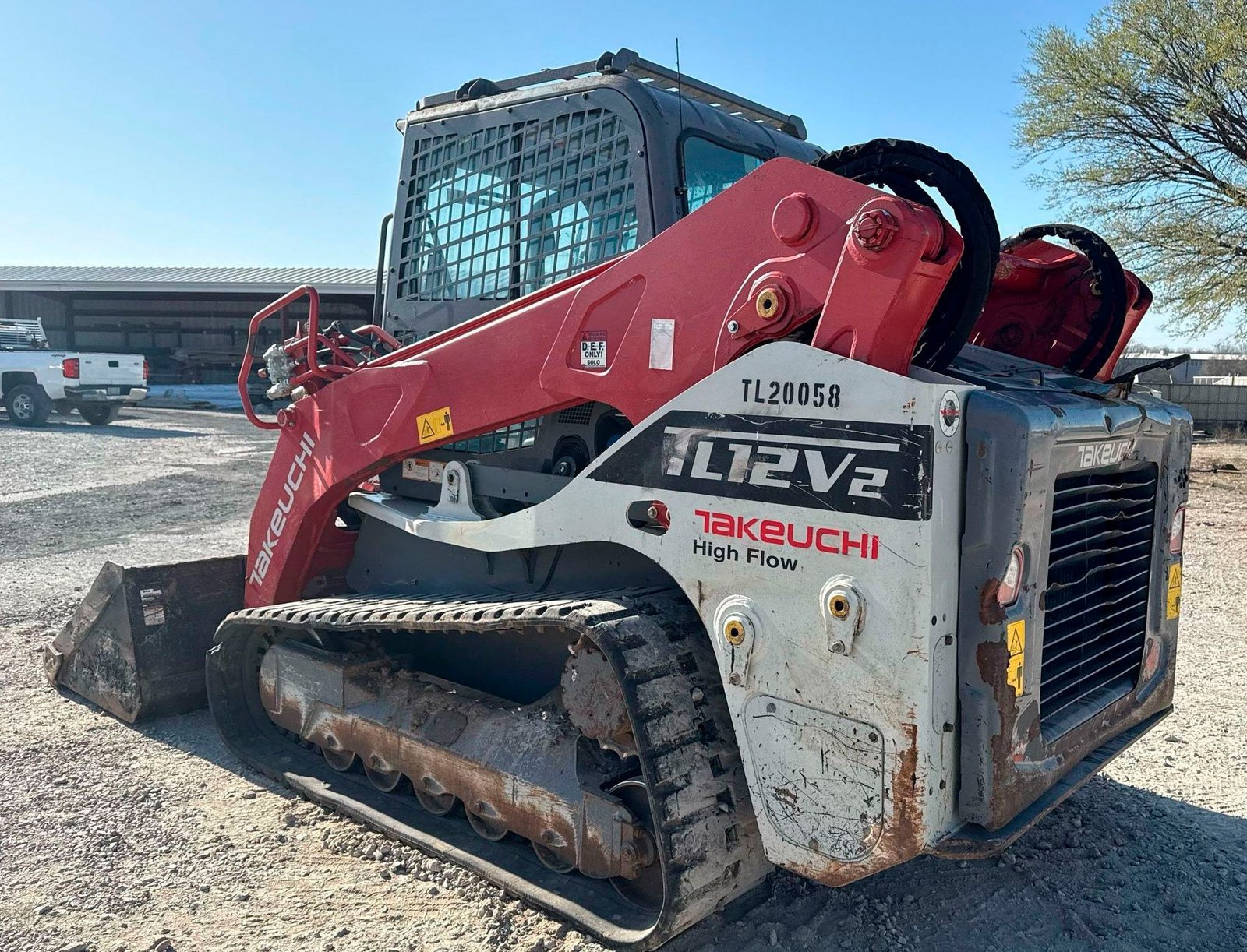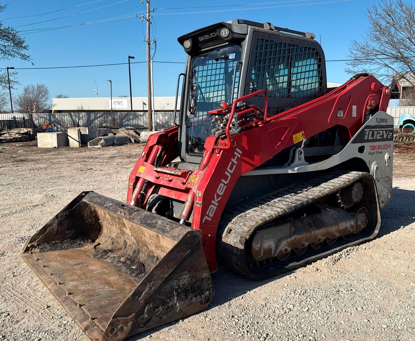 2020 Takeuchi TL12V-2 Tracked Skid Steer Loader — high-capacity vertical-lift loader with enclosed cab and hydraulic quick coupler.